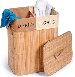 Tatkraft Fortuna, Panier à Linge en Bambou avec 2 Compartiments et Système d’Aération, pour Clair et Foncé, Bambou 100% Naturel, Sac en Textile d'une Capacité de 60L