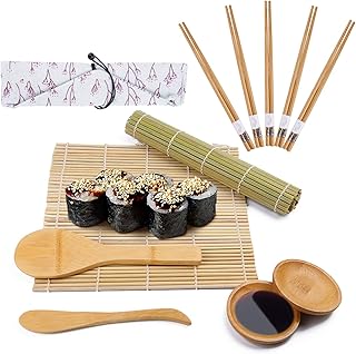Viesap Kit à Sushi, 12 pièces Tapis de Sushi - Bambou 100% Naturel,Bambou Sushi Maker Kit-5 Paires de Baguettes avec Sac de Rangement,2 Tapis à Rouler en Bambou,2 Palette,pagaie de Riz,spatule à Riz.