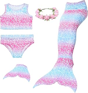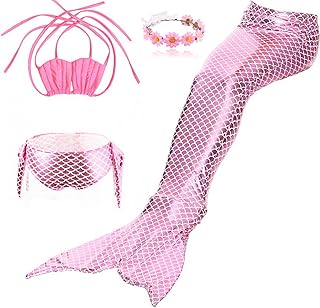DAXIANG 4 Pièces Costume Maillot de Bain Bikini Queue de Sirène Déguisement Princess pour Enfante 2-12 Ans (Il y a la Bouton de la Queue,Pouvez Ajouter la Monopalme)