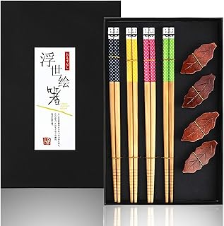 Maxjaa Ensemble-cadeau de Baguettes, 4 Paires de Baguettes en Bois Ensemble de Vaisselle Chinoise Antidérapante Réutilisable avec 4 Baguettes en Bois Support pour Nouilles de Riz Sushi