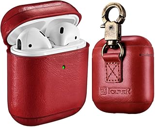 Coque AirPods, Icarer Étui Housse en Cuir Véritable [Ultra Mince] Portable Antichoc Protection Housse Etui Coque avec Porte-clés pour Apple AirPods1&2 Earphones Case (Témoin LED Visible) (Rouge)