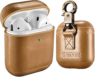 Coque AirPods, Icarer Étui Housse en Cuir Véritable [Ultra Mince] Portable Antichoc Protection Housse Etui Coque avec Porte-clés pour Apple AirPods1&2 Earphones Case (Témoin LED Visible) (Kaki)
